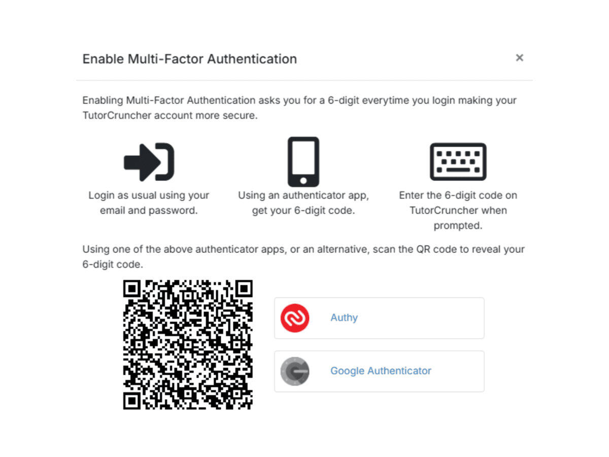 Additionally, TutorCruncher offers multi-factor authentication (MFA), requiring users to verify their identity through an extra step, typically using a code sent to their mobile device or generated by an authenticator app.
